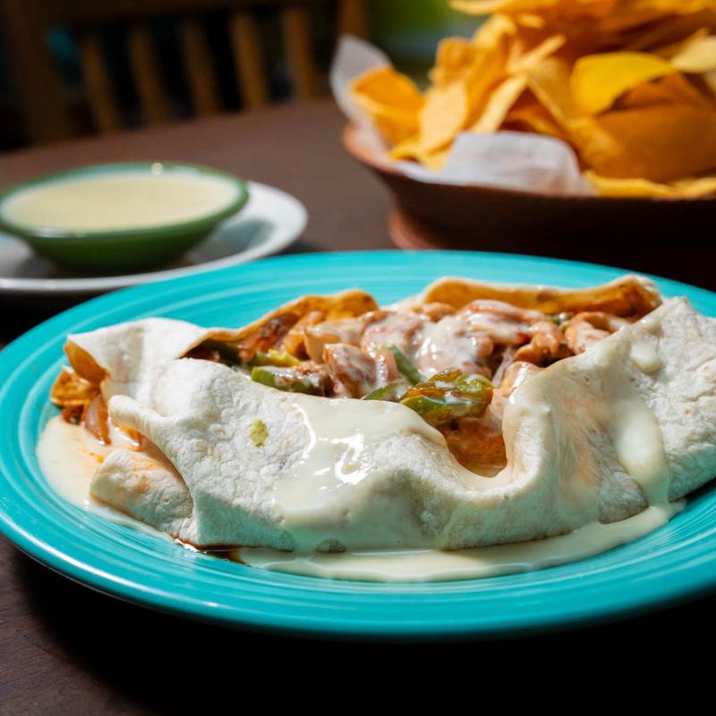 Steak or Grilled Chicken cooked with Bell Peppers, Ranchero Sauce and Onions, Drenched in Queso.